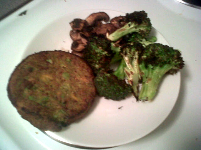 LunchRoasted broccoli and mushrooms w/ garlic salt and a Dr. Praegers California Veggie burger